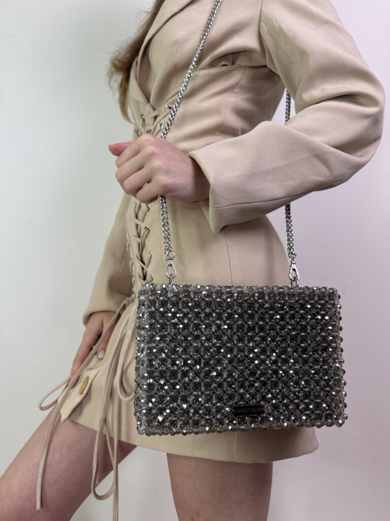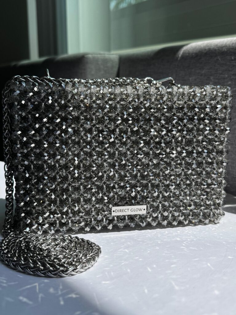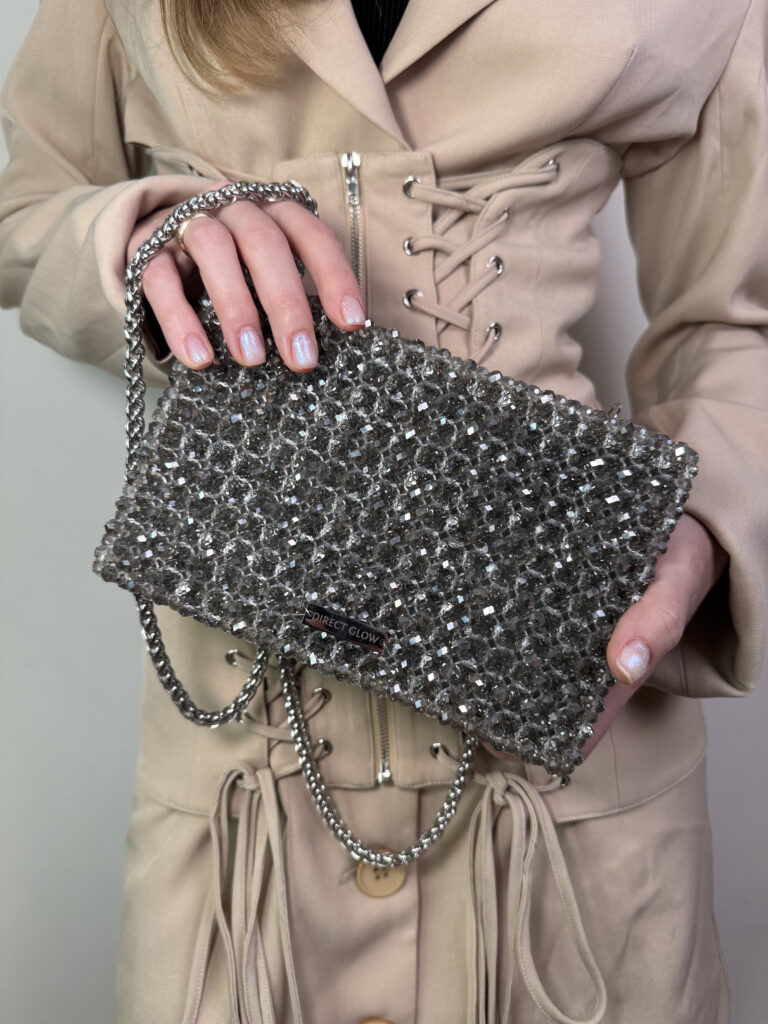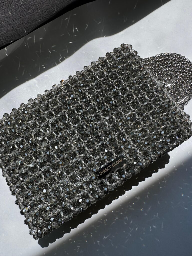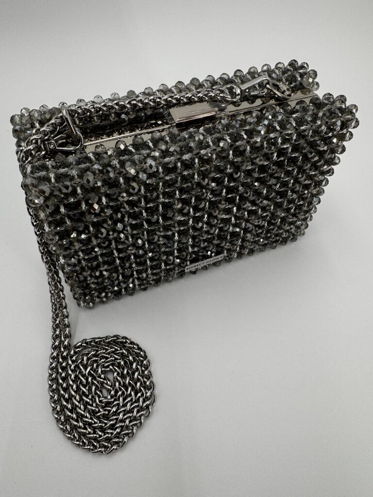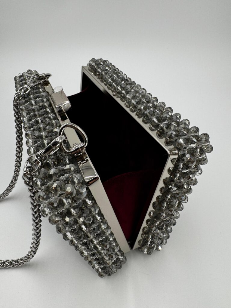 The Aurora is a dazzling clutch box handcrafted from faceted glass beads, offering a sleek, structured silhouette with timeless elegance. Its boxy shape adds a bold, modern twist to a classic evening accessory. Inside, it features a soft suede lining that elevates the luxurious feel. The included 120 cm (47.2 in) metal chain allows for shoulder or crossbody wear. Despite its compact look, Aurora comfortably fits any smartphone and other daily essentials. Perfect for formal occasions or stylish nights out — it brings radiant charm and sophistication to your look.