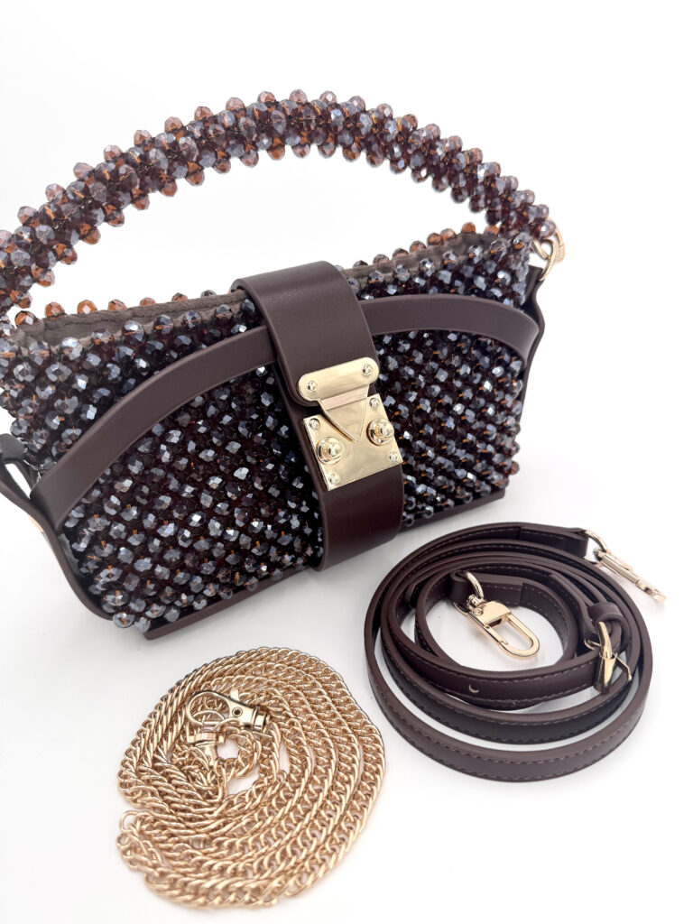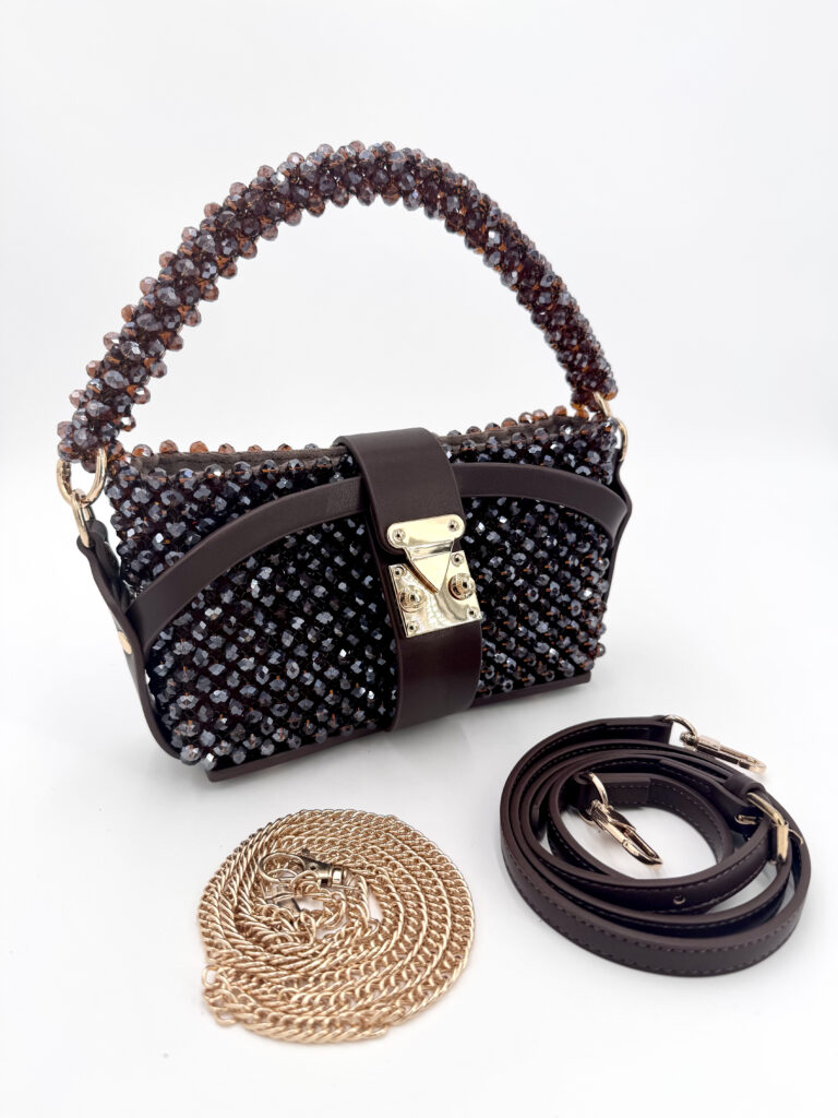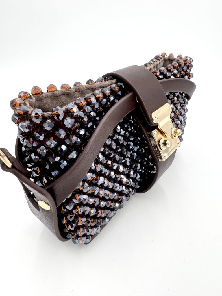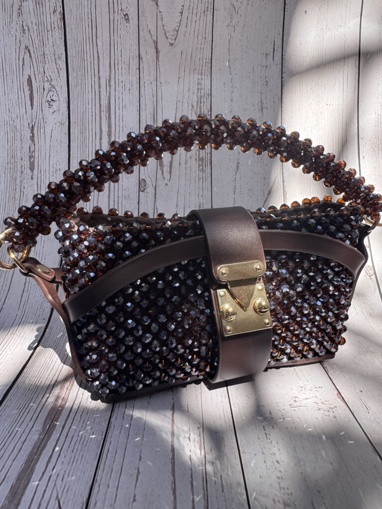 A refined blend of craftsmanship and style, the LORA bag is handcrafted from faceted glass beads and finished with eco-leather in your choice of black or rich brown. Designed for ultimate personalization, LORA is available in up to 8 carefully matched shades to perfectly complement the base tone. It features a beaded handle for elegant hand or elbow carry, a removable faux leather strap (adjustable 100–120 cm / 39.4–47.2 in), and a matching metal chain. Inside, you’ll find a choice of satin or velvet lining in a color that completes the look. Spacious enough to hold your phone and everyday essentials — LORA is a perfect fusion of elegance and versatility.