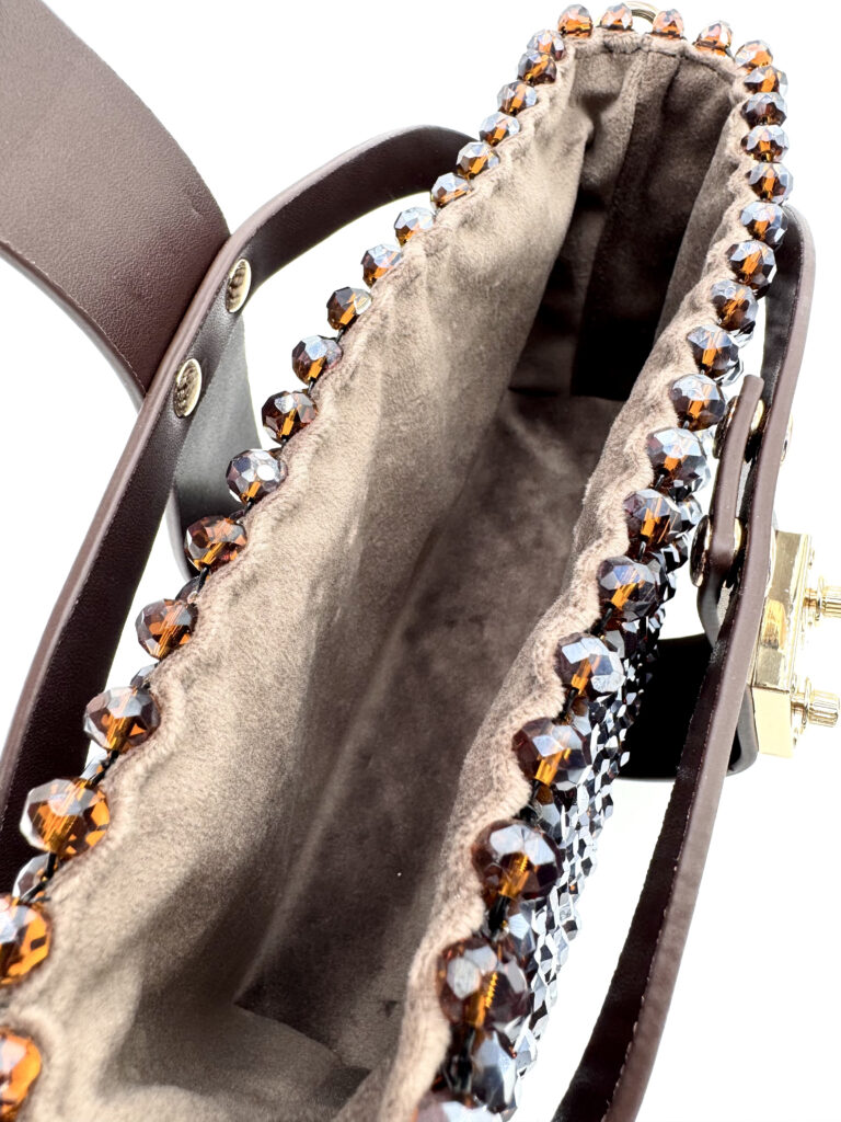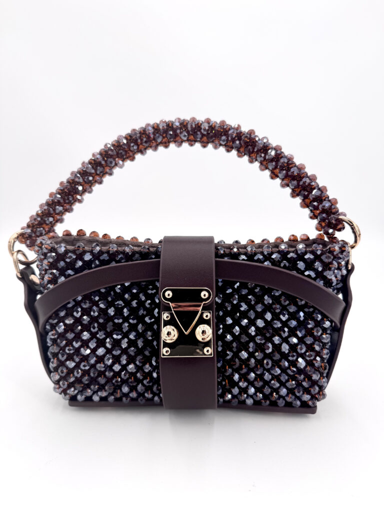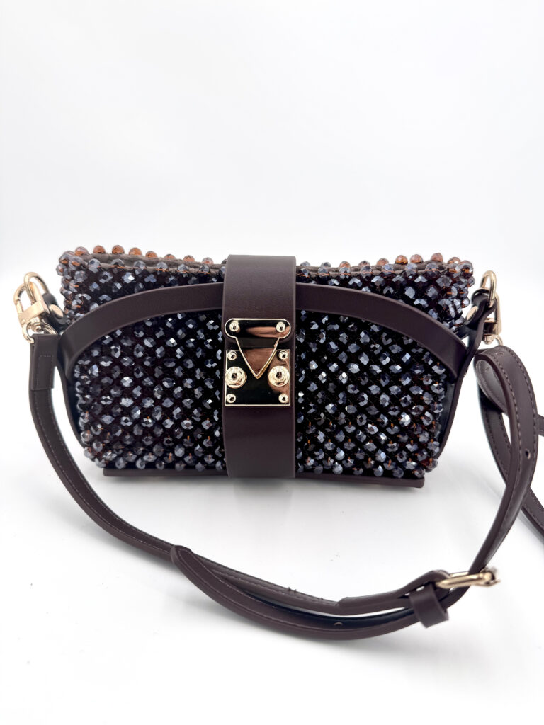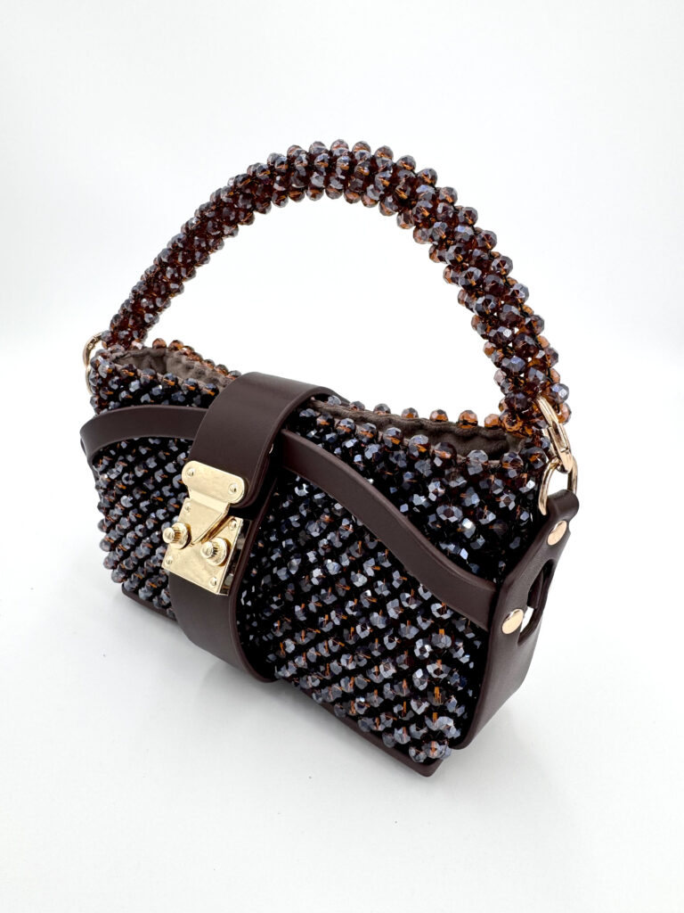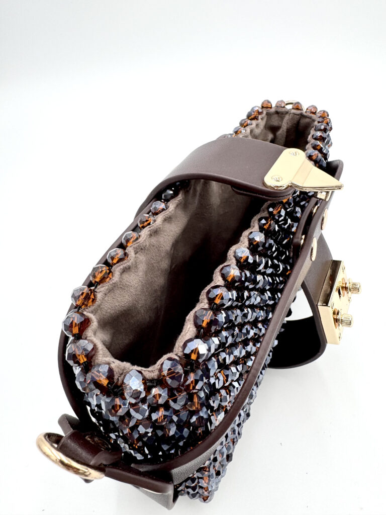 A refined blend of craftsmanship and style, the LORA bag is handcrafted from faceted glass beads and finished with eco-leather in your choice of black or rich brown. Designed for ultimate personalization, LORA is available in up to 8 carefully matched shades to perfectly complement the base tone. It features a beaded handle for elegant hand or elbow carry, a removable faux leather strap (adjustable 100–120 cm / 39.4–47.2 in), and a matching metal chain. Inside, you’ll find a choice of satin or velvet lining in a color that completes the look. Spacious enough to hold your phone and everyday essentials — LORA is a perfect fusion of elegance and versatility.