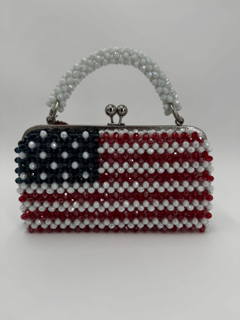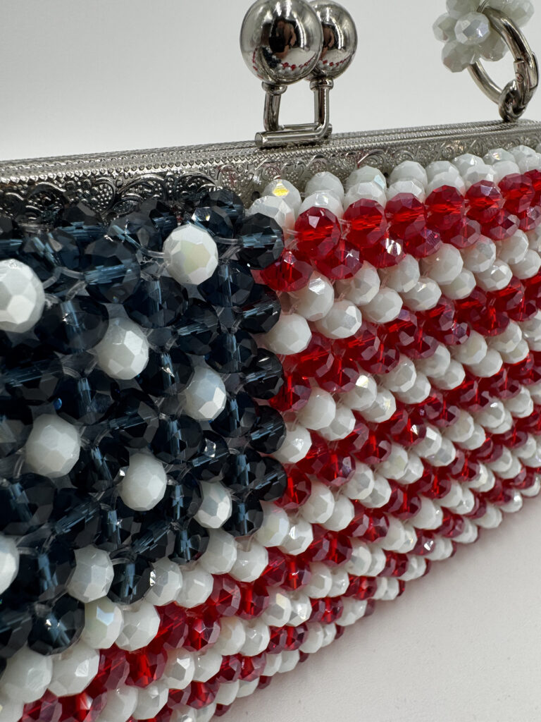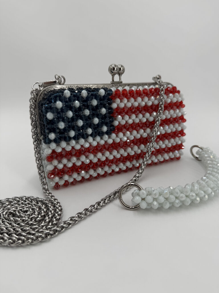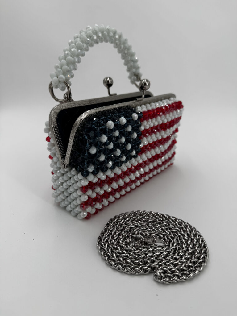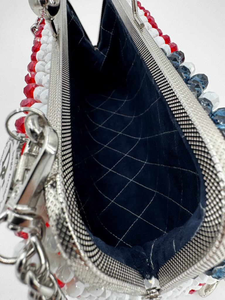 The Moon Slim bag is a sleek, elongated version of the classic Moon bag — slimmer in shape, yet spacious enough to fit any smartphone and daily essentials. Made from glass beads, it can also be customized with a flag design or personalized pattern. The interior features a quilted velvet lining. The bag is available with a metal handle or a beaded handle, and comes with a matching metal chain strap.