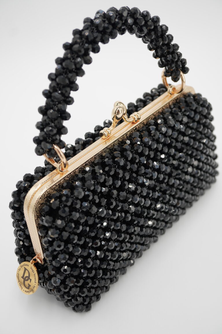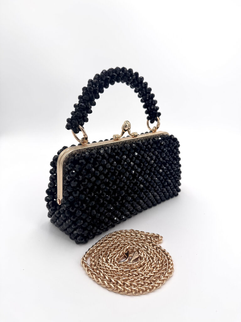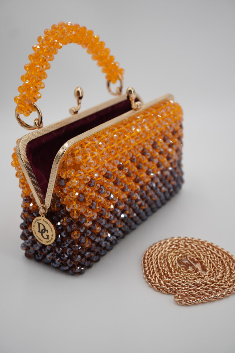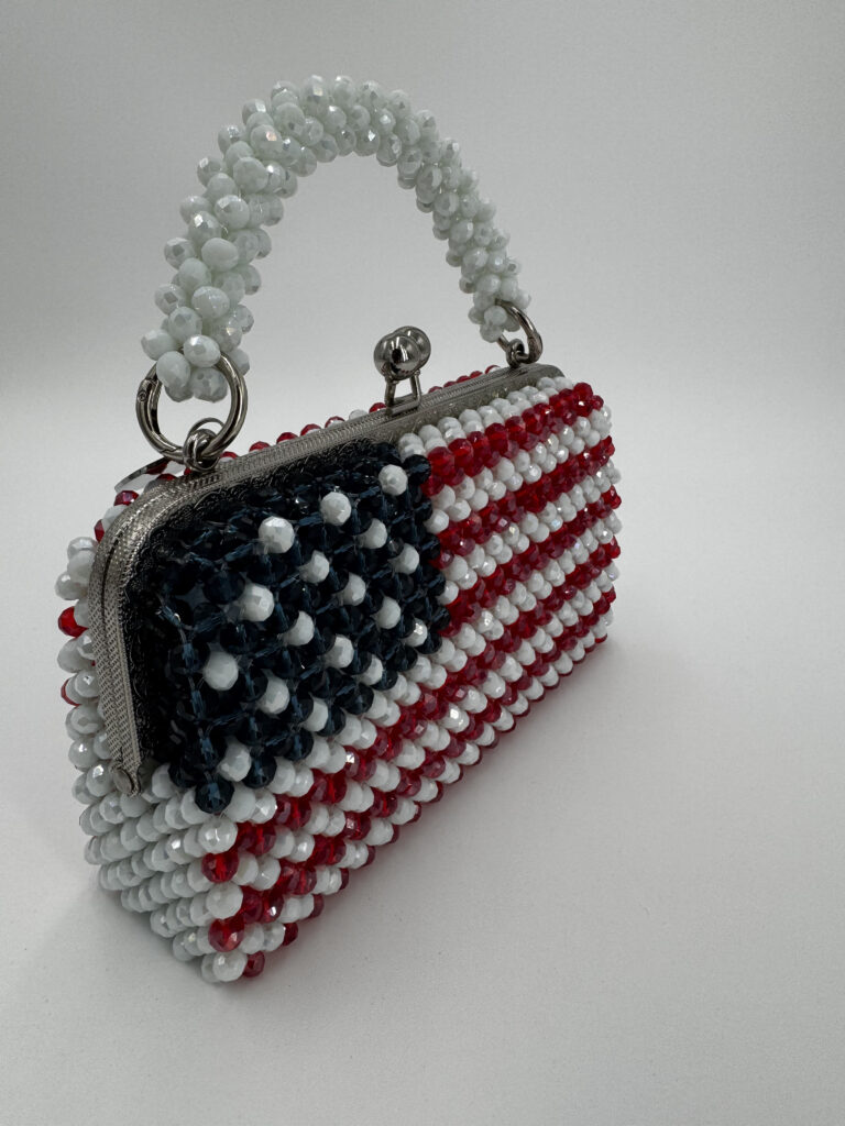 The Moon Slim bag is a sleek, elongated version of the classic Moon bag — slimmer in shape, yet spacious enough to fit any smartphone and daily essentials. Made from glass beads, it can also be customized with a flag design or personalized pattern. The interior features a quilted velvet lining. The bag is available with a metal handle or a beaded handle, and comes with a matching metal chain strap.